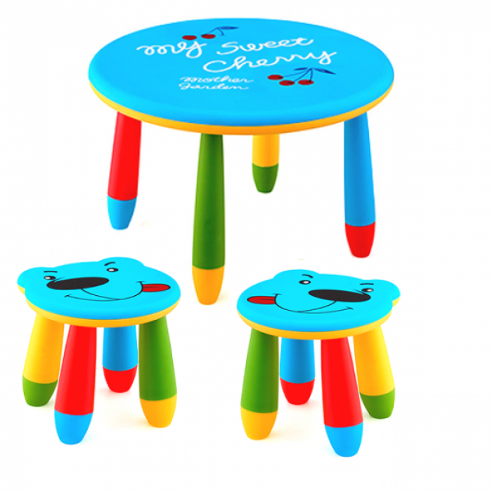 Set mobilier copii RAKI, plastic, masa rotunda SLANTE D70xh47cm albastra cu 2 scaune URSULET albastru