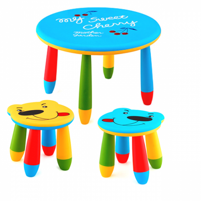 Set mobilier copii RAKI, plastic, masa rotunda SLANTE D70xh47cm albastra cu 2 scaune URSULET galben si albastru