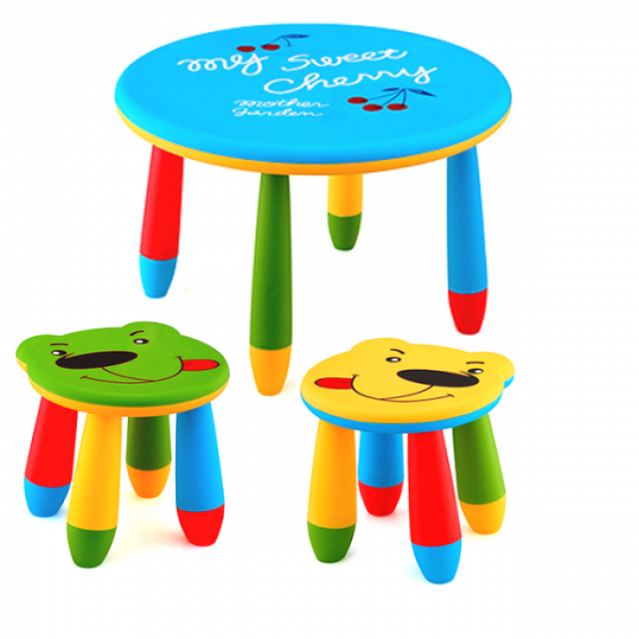 Set mobilier copii RAKI, plastic, masa rotunda SLANTE D70xh47cm albastra cu 2 scaune URSULET galben si verde