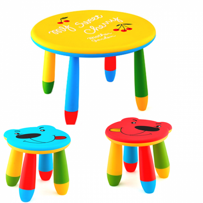 Set mobilier copii RAKI, plastic, masa rotunda SLANTE D70xh47cm galbena cu 2 scaune URSULET albastru si rosu