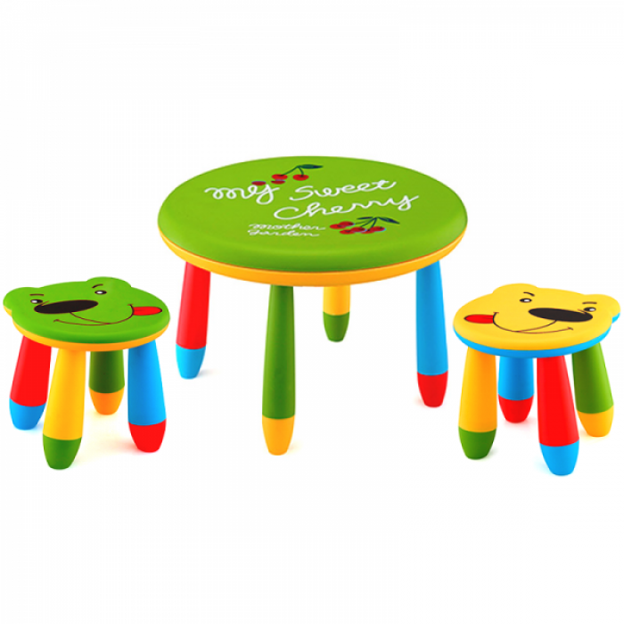 Set mobilier copii RAKI, plastic, masa rotunda SLANTE D70xh47cm verde cu 2 scaune URSULET galben si verde