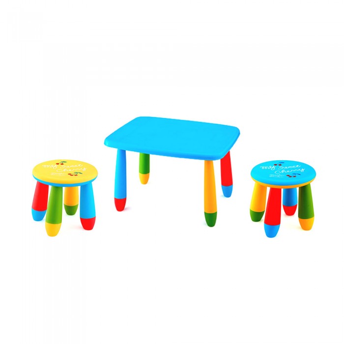 Set mobilier copii RAKI, plastic, masa dreptunghiulara MASHA 72,5x57xh47cm albastra cu 2 scaune GOGOASA galben si albastru