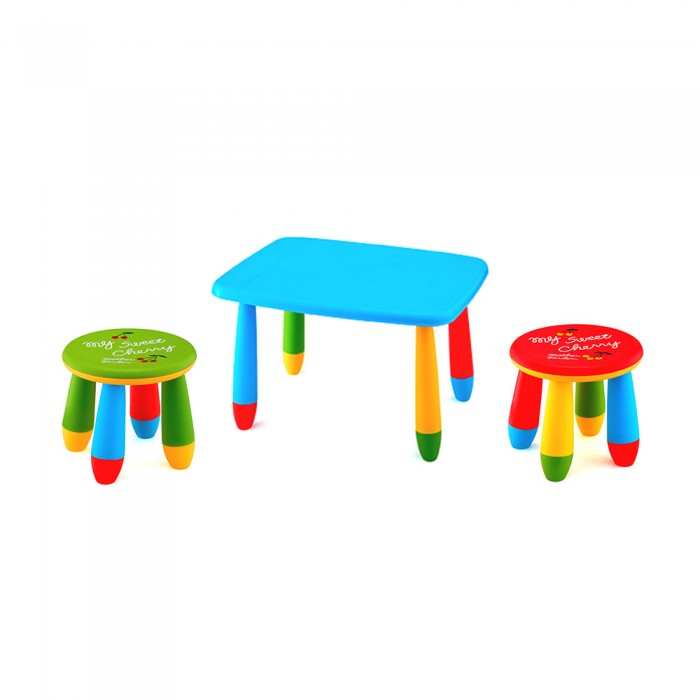 Set mobilier copii RAKI, plastic, masa dreptunghiulara MASHA 72,5x57xh47cm albastra cu 2 scaune GOGOASA verde si rosu