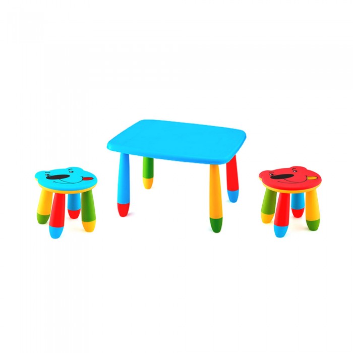 Set mobilier copii RAKI, plastic, masa dreptunghiulara MASHA 72,5x57xh47cm albastra cu 2 scaune URSULET albastru si rosu