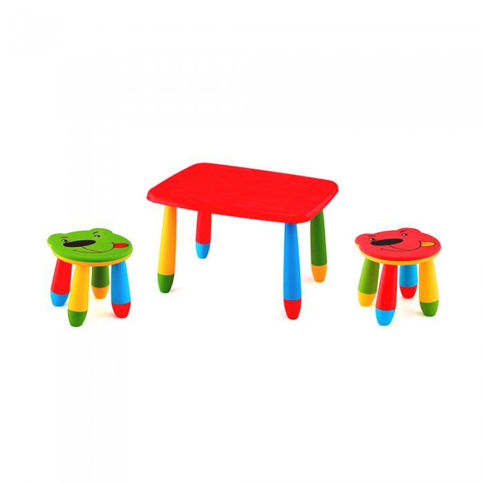 Set mobilier copii RAKI, plastic, masa dreptunghiulara MASHA 72,5x57xh47cm rosie cu 2 scaune URSULET verde si rosu