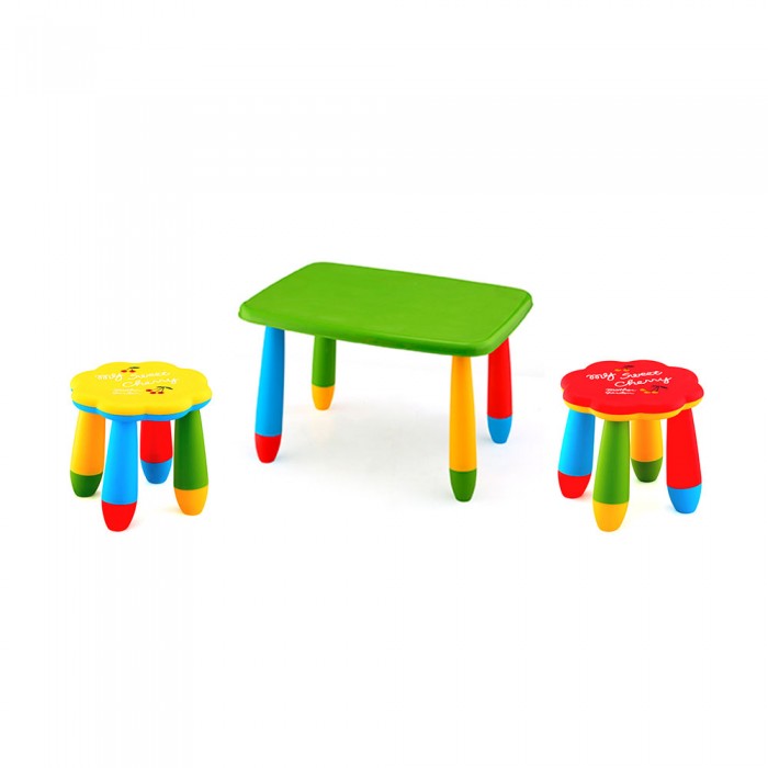 Set mobilier copii RAKI, plastic, masa dreptunghiulara MASHA 72,5x57xh47cm verde cu 2 scaune FLOARE galben si rosu