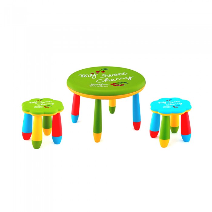 Set mobilier copii RAKI, plastic, masa rotunda SLANTE D70xh47cm verde cu 2 scaune FLOARE verde si albastru