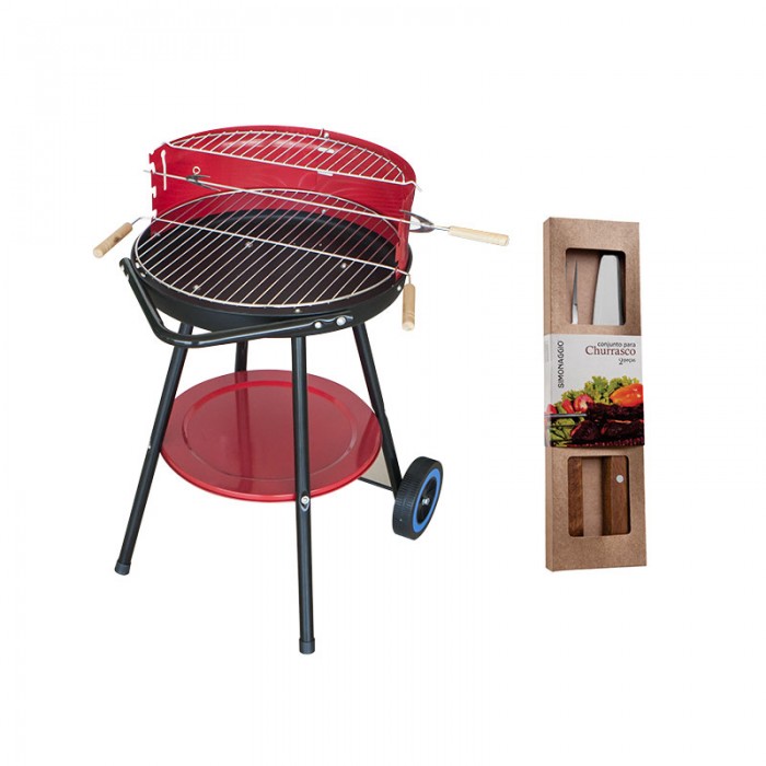 Gratar pe carbuni RAKI, D44xh74cm, grill D40cm, vas carbuni emailat + set furculita gratar si cutit 20cm SIMONAGGIO CHURRASCO