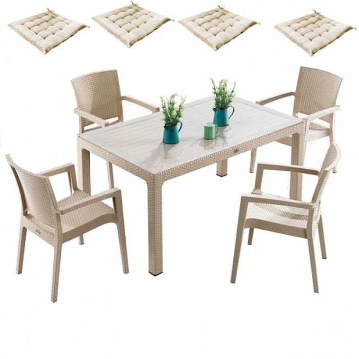 Mobila gradina INGLESA masa CLASSI RATAN 90x150x75cm 4 scaune PARIS RATTAN polipropilen/fibra sticla culoare capucino,4 perne scaun B004297-42322-42333