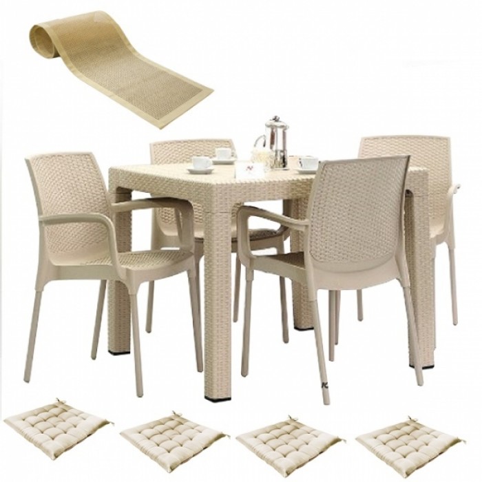Set terasa MAITAS masa patrata CLASSI RATAN 90x90x75cm 4 scaune SUNSET RATTAN polipropilen/fibra sticla culoare capucino,4 perne scaun,Traversa PANARI 40x150cm B004256-42301-42310