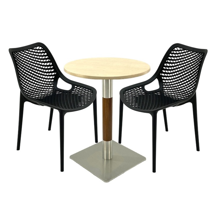 Mobilier de terasa bar, 2 scaune London Air negru suprapozabile cu masa rotunda 60x72cm Raki MAPLE blat werzalit si picior crom aspect lemn