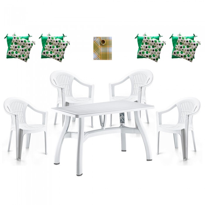 Set gradina RAKI, masa King 115x70xh73cm cu 4 scaune Carnaval 53x45xh78cm plastic alb, 4 perne scaun, fata de masa 220x150cm.